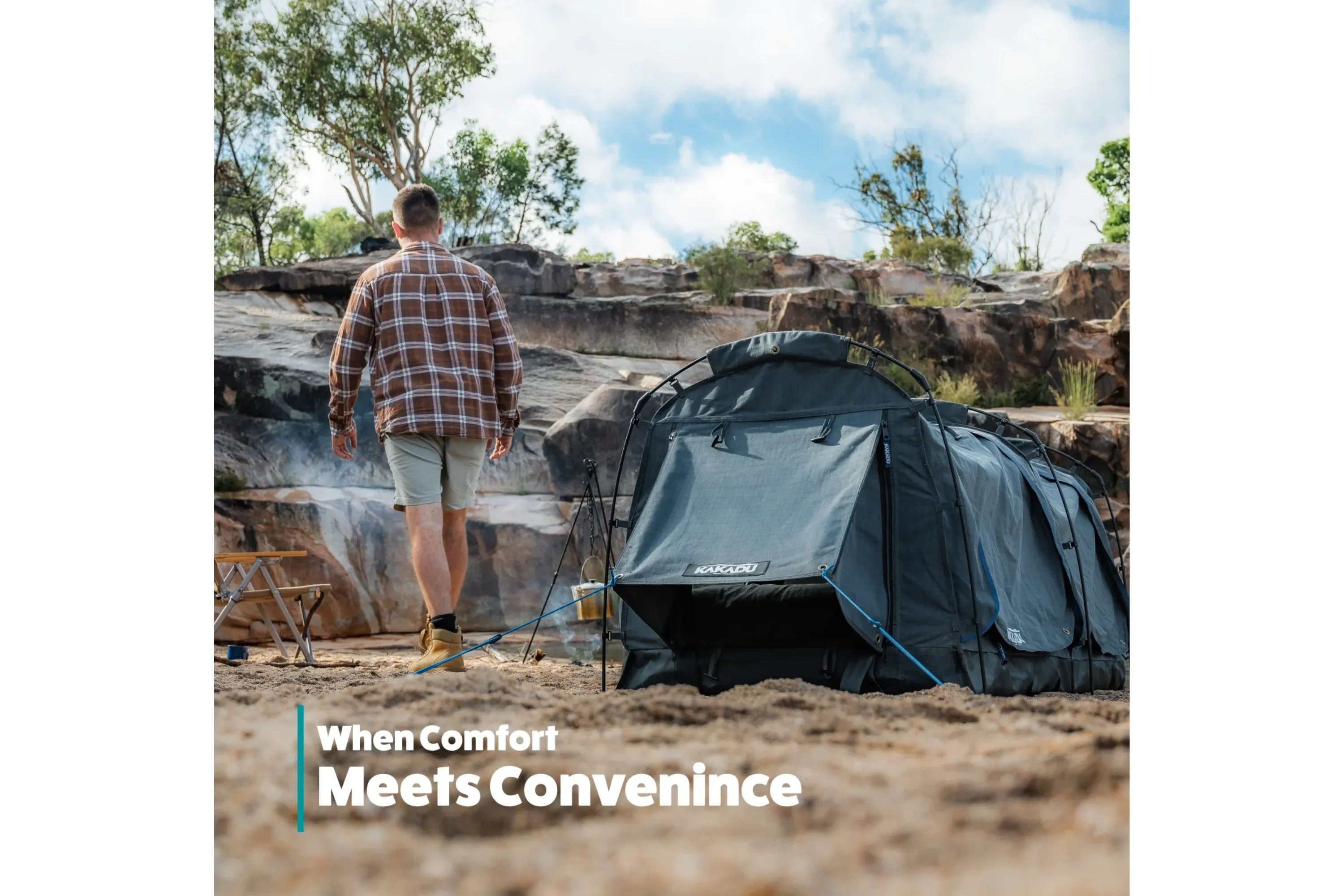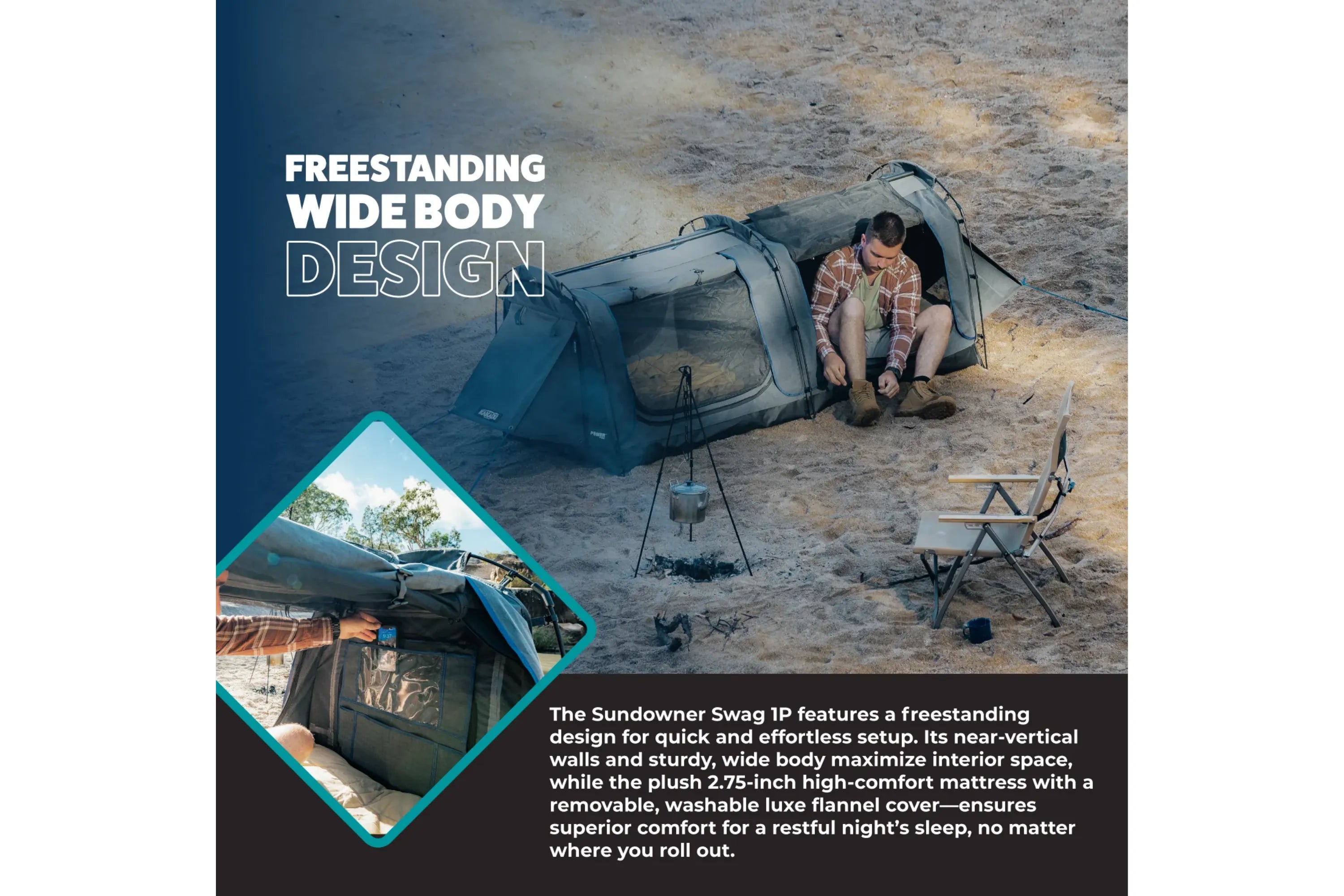 The Kakadu Sundowner Swag 1 Person is a rugged, freestanding swag designed for quick setup and maximum comfort. Its near-vertical walls and wide body provide plenty of room, while the 2.75” high-density foam mattress with a luxe flannel cover ensures a great night’s sleep.