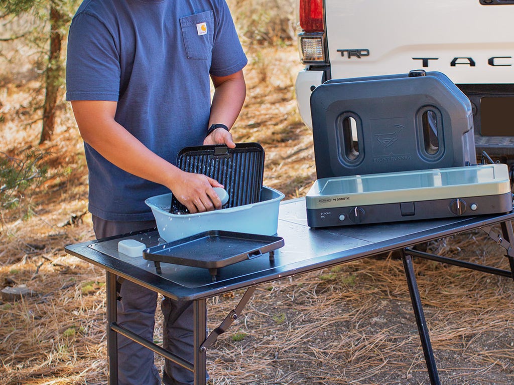 The Soft Soak is a highly versatile, silicone cleaning bowl. This particular square bowl was designed to soak the griddle plates of the Cadac 2 Cook Gas Cooker, which requires soapy water to clean while protecting the grill’s non-stick properties.