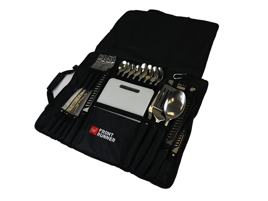 A high quality kitchen utensil set. Everything you need for cooking and eating can be hung at the campsite and rolls up securely for safe, rattle-free transport.