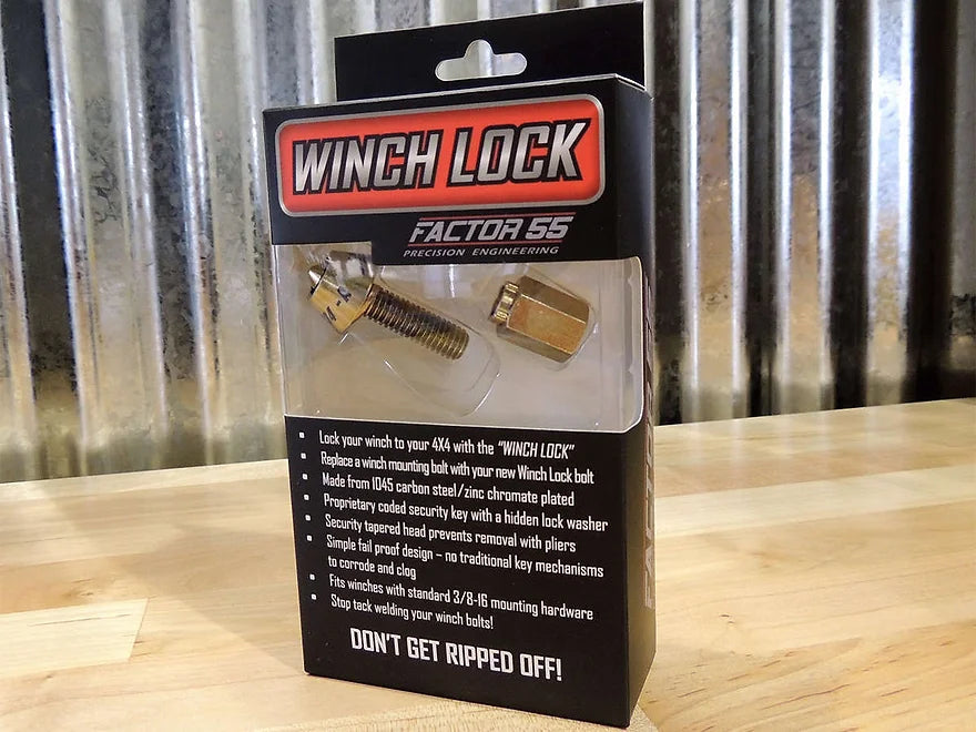 - The winch lock bolt is a custom 3/8-16 precision security bolt made from 1045 carbon alloy steel heat treated to Grade 5 yield strength.