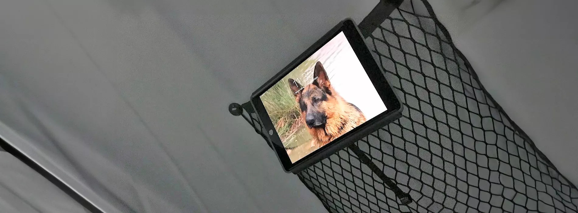 This support is meant to be attached to the cargo net on the internal top of the tent, allowing you to mount your tablet for a handsfree viewing experience.